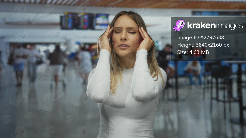 Woman pressing temples with closed eyes at busy airport terminal reflecting stress and travel fatigue amidst bustling crowd in a modern indoor setting. - Kraken Images