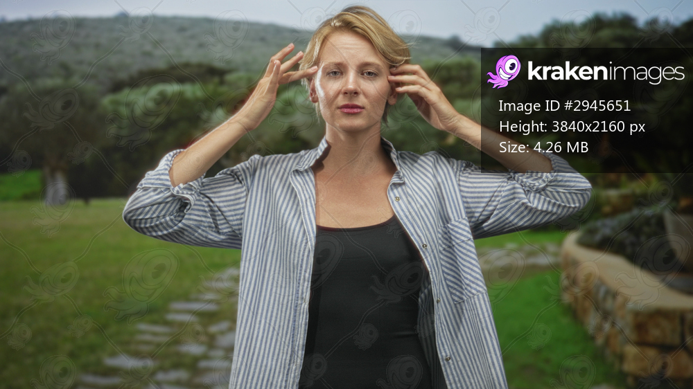 Woman pressing temples with fingertips and hands on forehead, eyes closed while standing on a stone path in a forest wearing a striped shirt and black tank top; stress. - Kraken Images