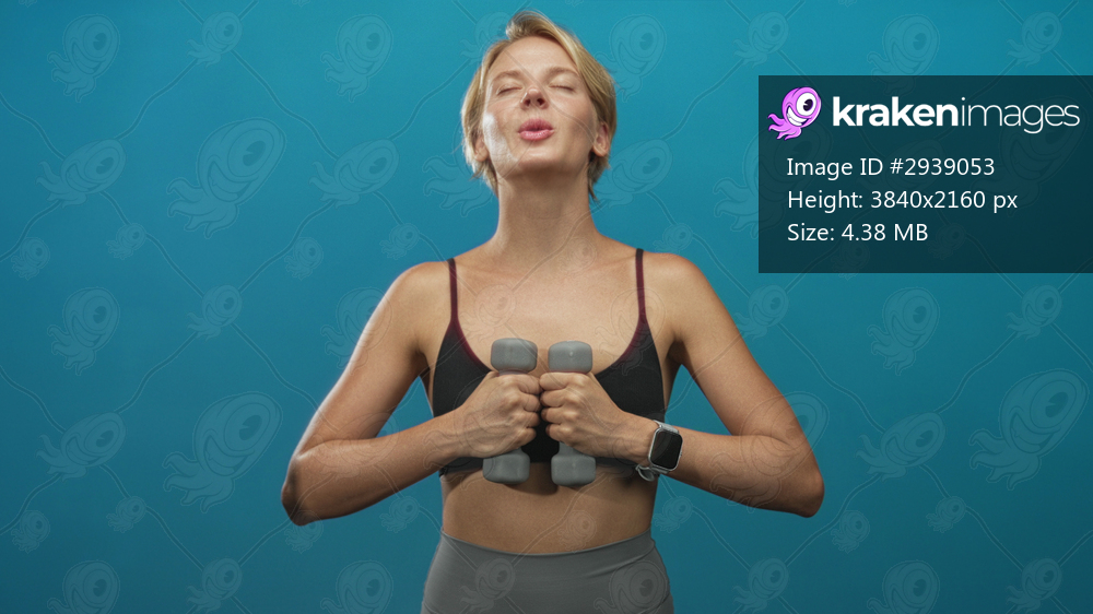 Woman pressing two dumbbells to chest in studio with eyes closed and neck tilted back, wearing sports bra and smartwatch; focus strength.