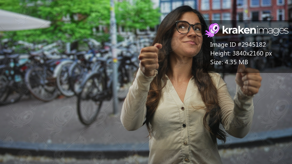 Woman pretending to steer with hands held like a steering wheel on a busy amsterdam street lined with parked bicycles; playful adventure.