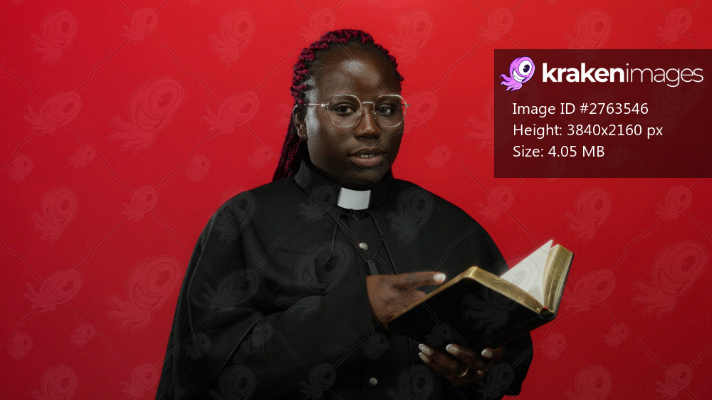Woman priest reading a bible against an isolated red background wall, embodying spirituality, leadership, and faith with a serious expression and focused demeanor. - Kraken Images