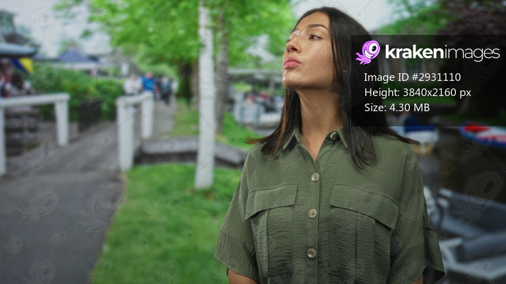 Woman profile face looking to side on street wearing green shirt by dock and narrow canal; serenity introspection.