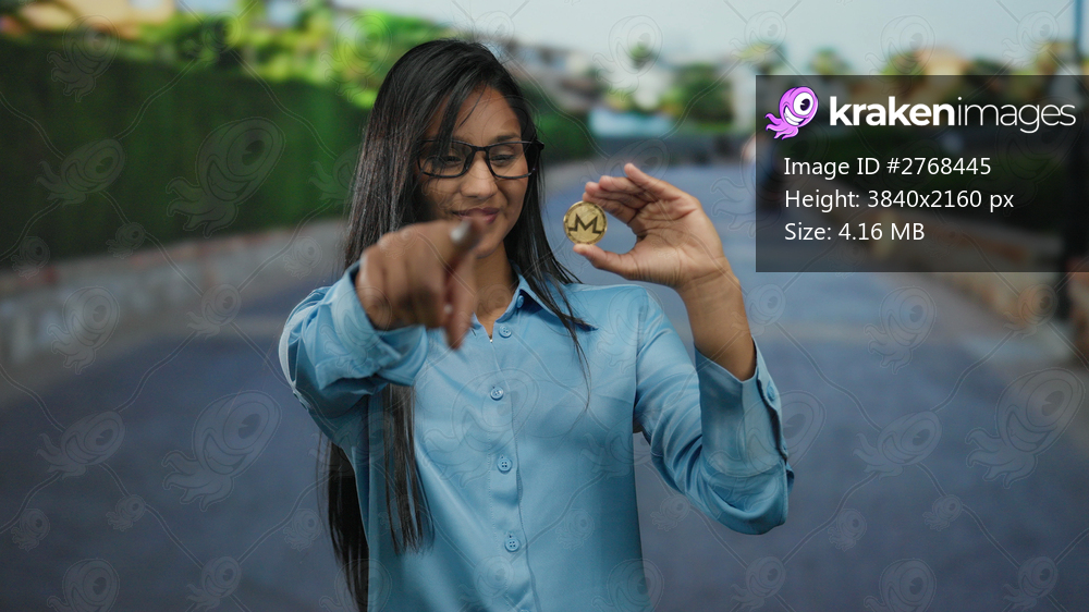 Woman proudly holds a monero coin while pointing and smiling outdoors, showcasing digital currency confidence in a sunny street environment.