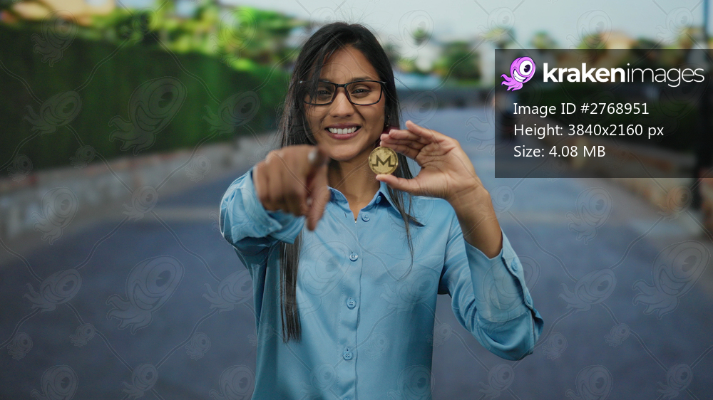 Woman proudly holds a monero coin while pointing and smiling outdoors, showcasing digital currency confidence in a sunny street environment.