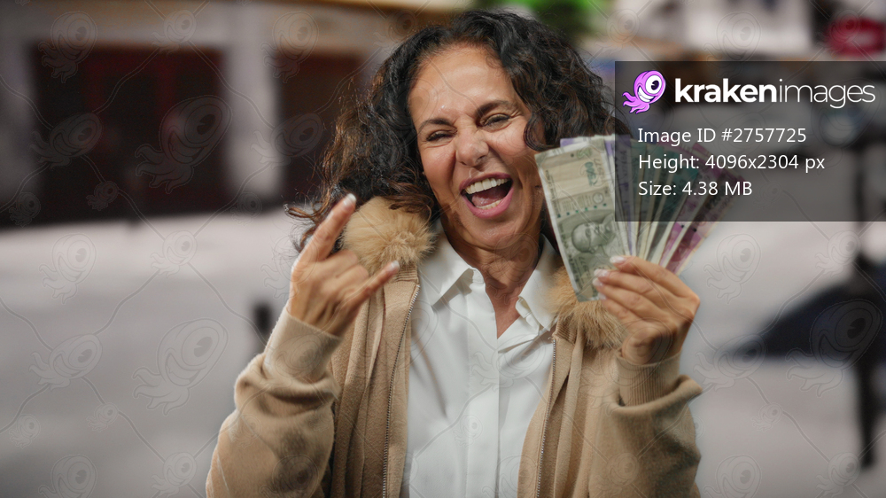 Woman proudly showing rupee banknotes making rock gesture on a vibrant city street, expressing joy and confidence outdoors.