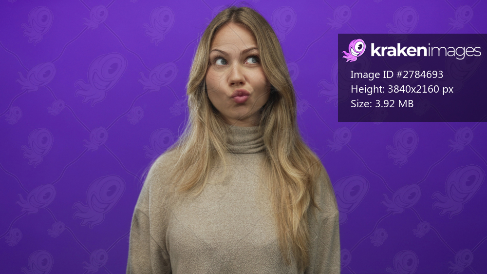 Woman puckered lips fish gesture wearing turtleneck sweater in purple studio closeup portrait session; playfulness joy whimsy humor.