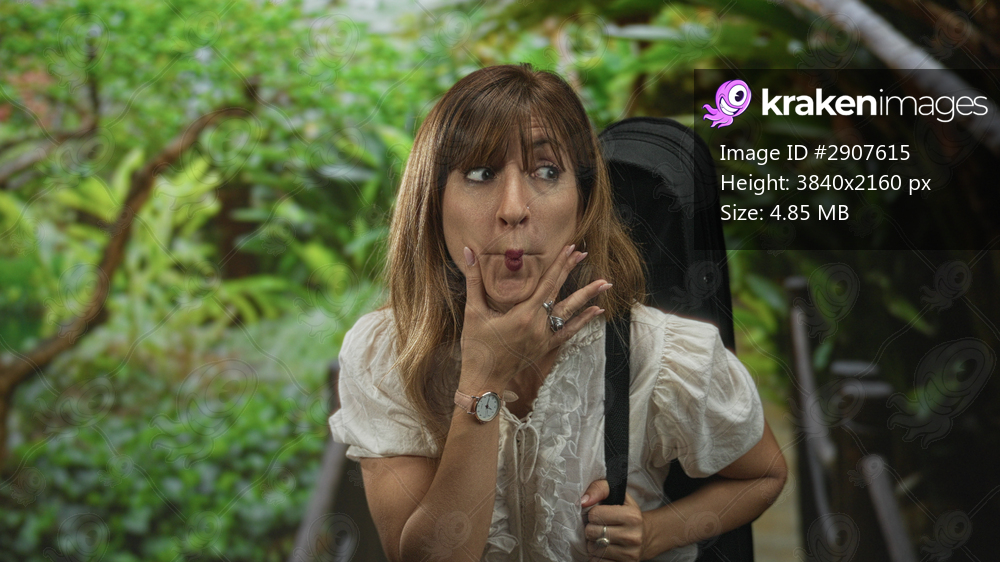 Woman puckering mouth with hand on chin in forest on wooden walkway wearing white blouse and carrying guitar case on back; playful.