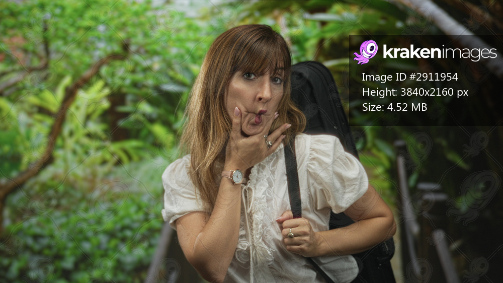 Woman puckering mouth with hand on chin in forest on wooden walkway wearing white blouse and carrying guitar case on back; playful.