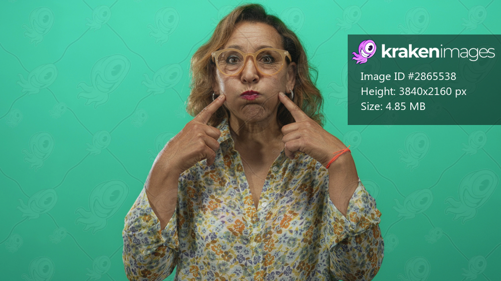 Woman with puffed cheeks pointing finger to cheek in studio against green background; playfulness whimsy.