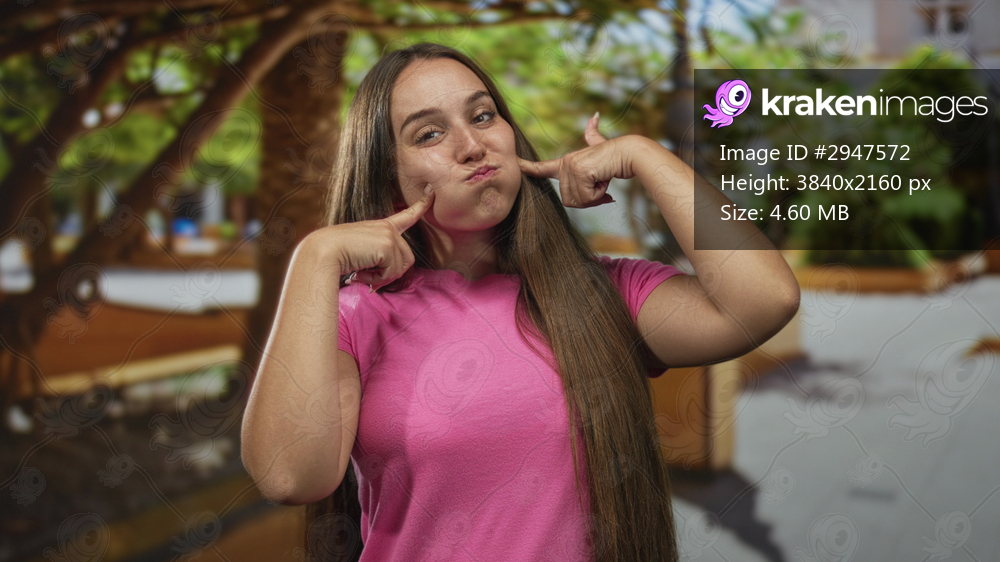 Woman puffing cheeks and points fingers to cheeks in park near trees wearing pink t shirt and long hair, outdoors; playful mischief.