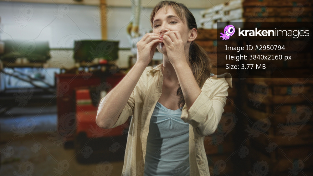 Woman pulling her lips with fingers and smiling in a building warehouse, bare shoulder exposed and casual shirt; playful curiosity.