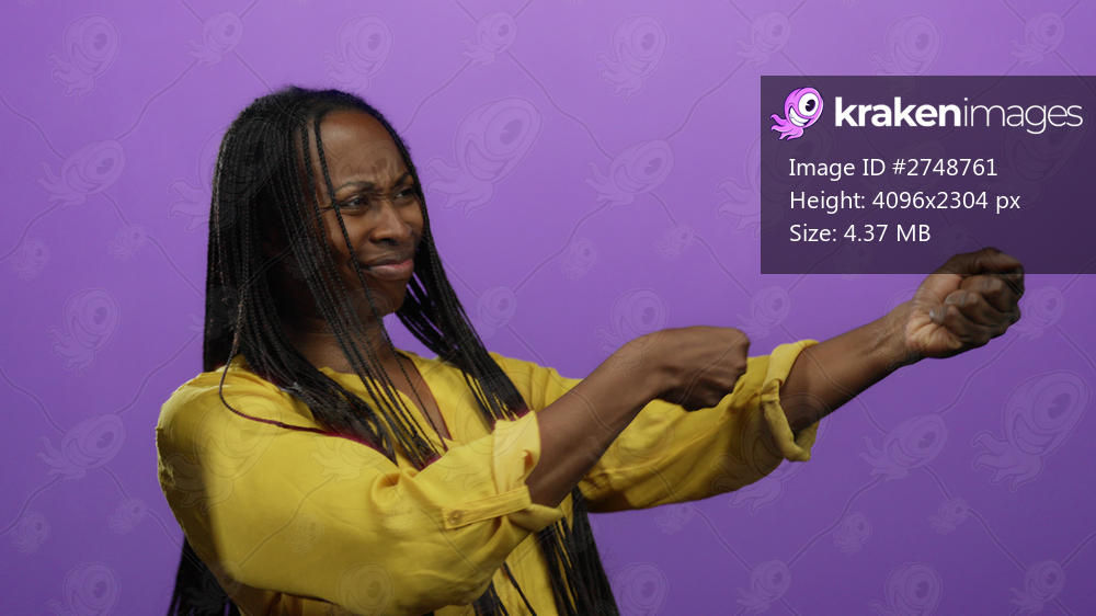 Woman pulling imaginary rope against vivid purple wall with curly hair and yellow shirt, expressing intense focus and creativity.