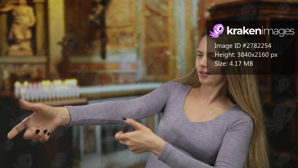 Woman pulling imaginary rope in historic church setting featuring lit candles creating a serene ambiance.