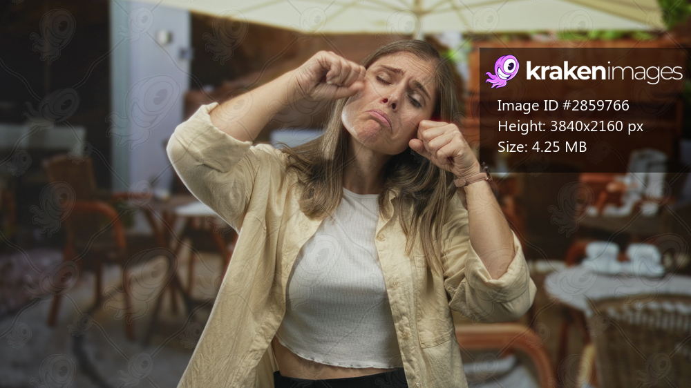 Woman pulls cheeks downward and clenches fists in building while pouting expression; sadness frustration.