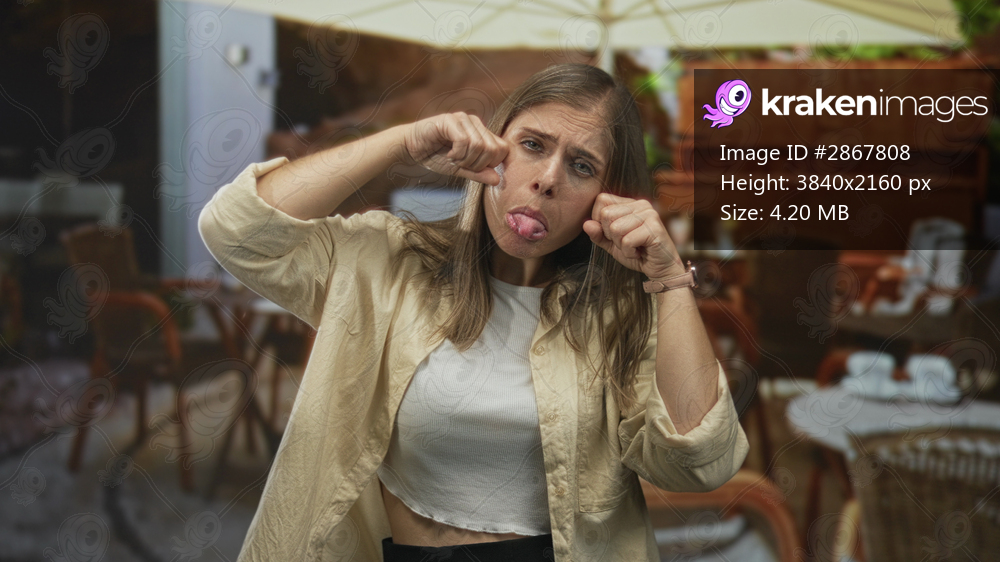 Woman pulls cheeks downward and clenches fists in building while pouting expression; sadness frustration.