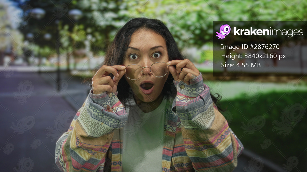 Woman pulls down round glasses on street beside green park trees, eyebrows raised in a questioning gesture; surprise curiosity.