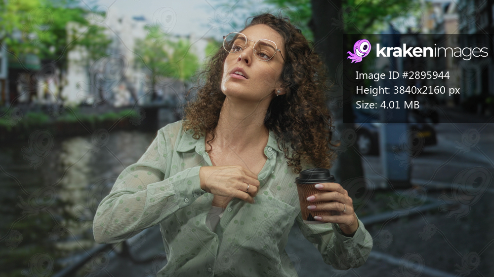 Woman pulls open green blouse revealing bare chest while holding takeaway coffee on street in amsterdam; heat discomfort.