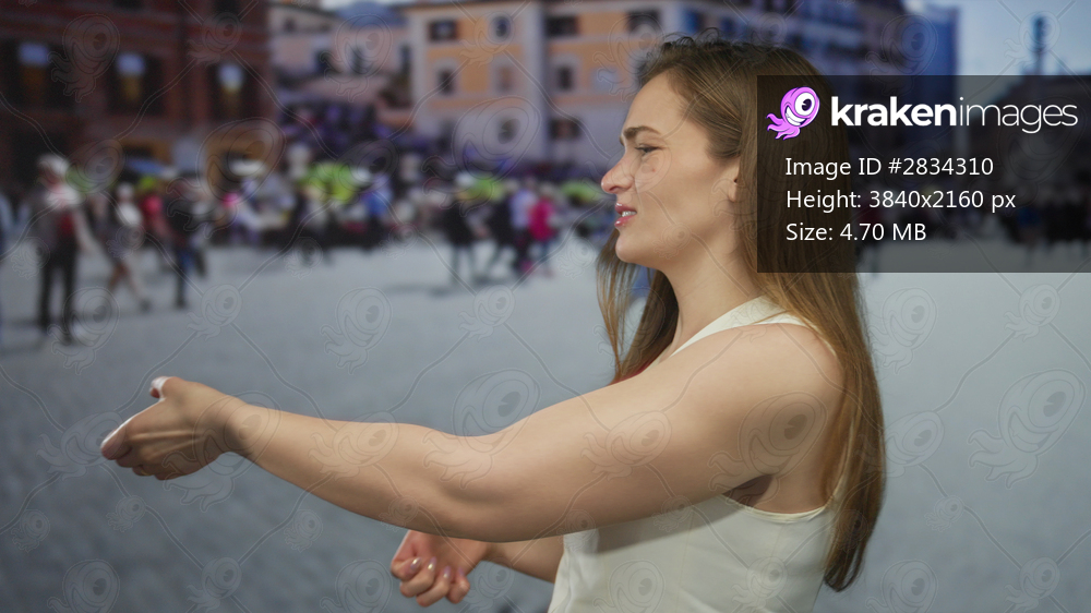 Woman pulls rope gesture with outstretched arms on busy city street under bright midday sun while grimacing; tension.