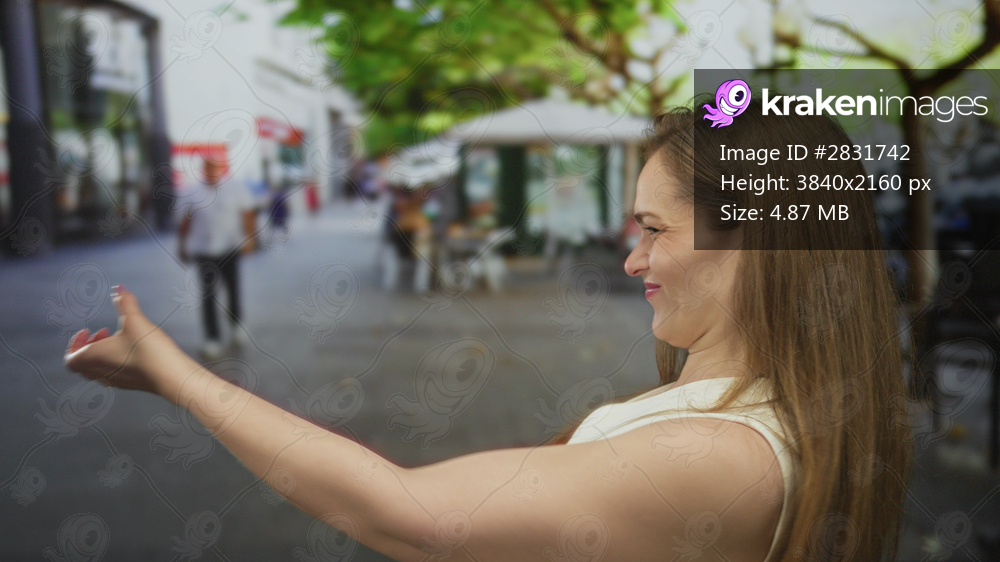 Woman pulls rope on busy street while leaning forward with focused expression under dappled sunlight; determination.