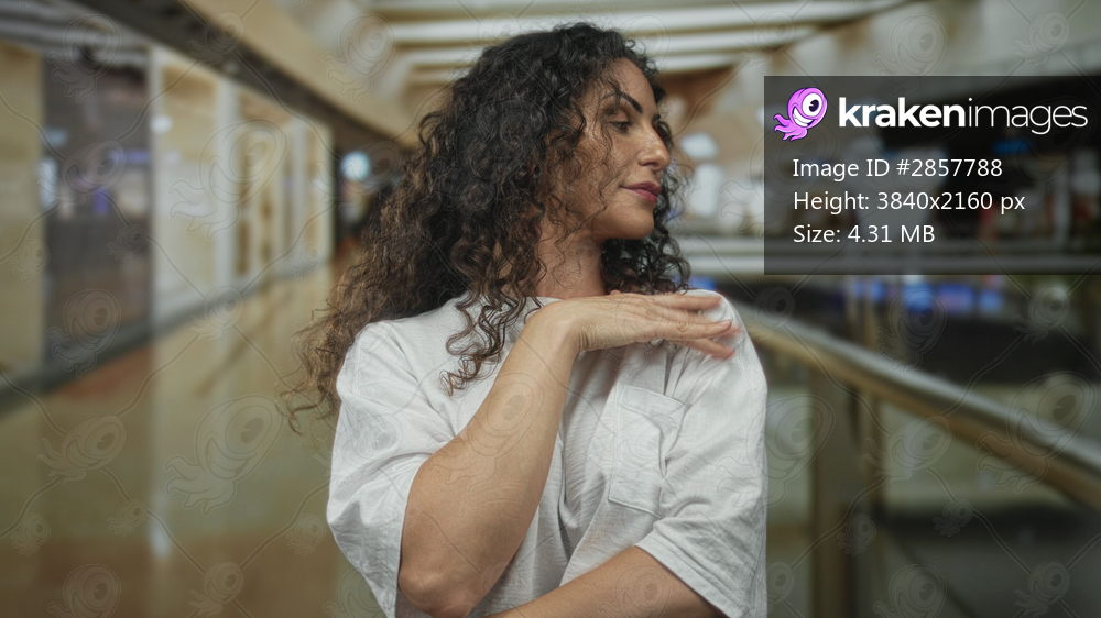 Woman pulls white t shirt collar in building corridor with curly hair falling over her shoulders; self confidence.