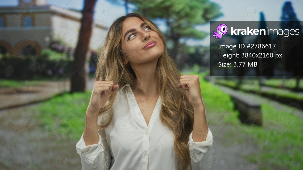 Woman pumping fists with bare arms in park; excitement victory.