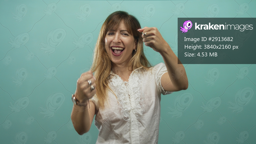 Woman pumping fists and grinning in teal studio wearing white blouse and rings on her hands close to camera; joy victory celebration.
