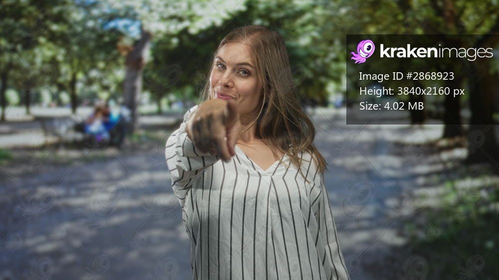 Woman pumps clenched fist with smiling expression on sunlit green park pathway next to blurred trees and bench; victory joy.