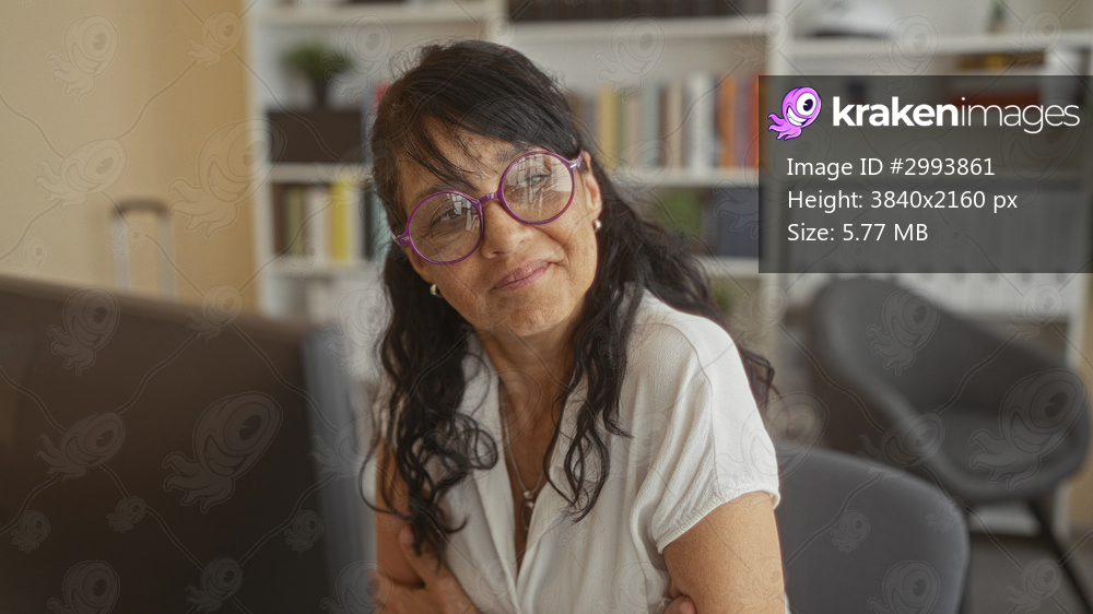 Woman with purple glasses wearing white blouse, arms crossed, smiles at computer monitor on desk in office building; everyday contentment.