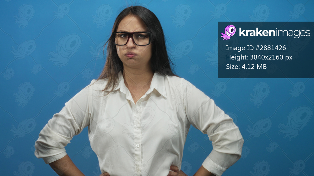 Woman with pursed lips and hands on hips in a blue studio wearing white shirt and glasses showing skeptical stare and firm pose; annoyance.