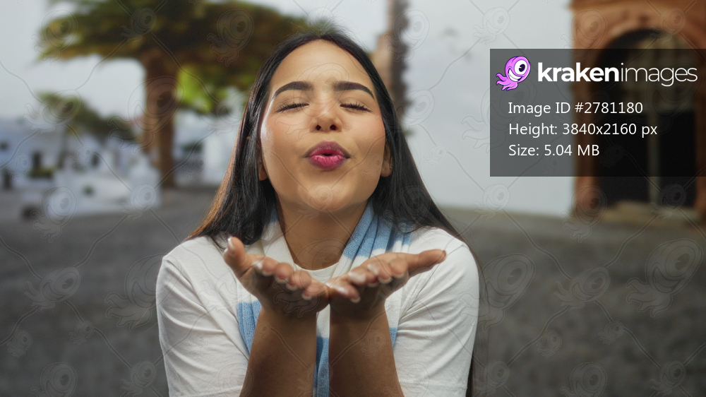 Woman purses lips in blowing pose within outdoor scene by a young latin hispanic figure, delivering kiss gestures filled with affection and crowned by a happy smile. - Kraken Images