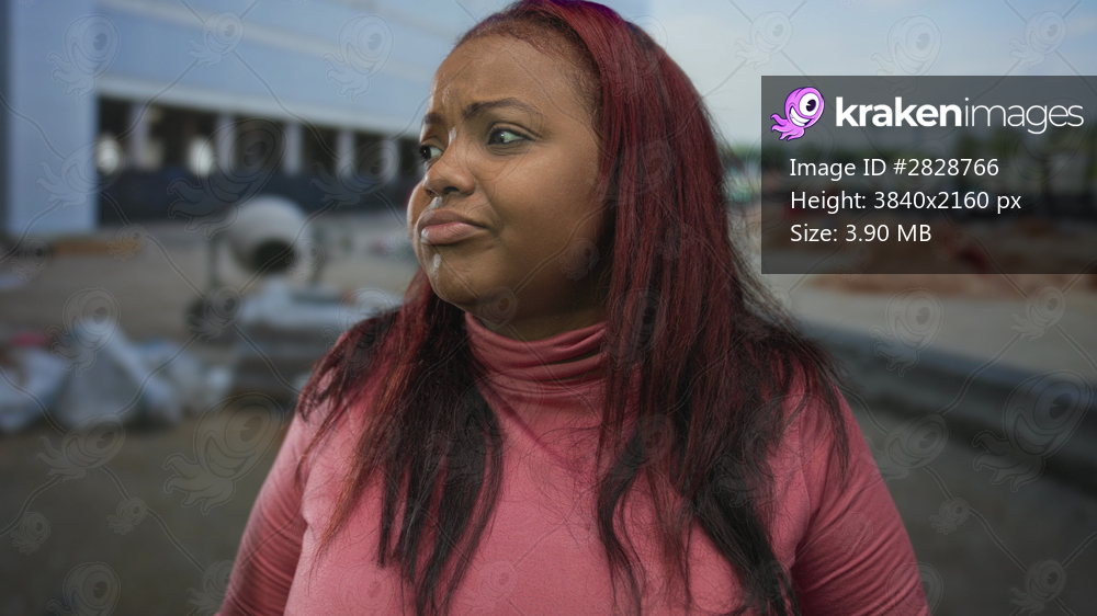 Woman purses lips outdoors at construction site near concrete mixer and scaffolding; annoyance frustration.