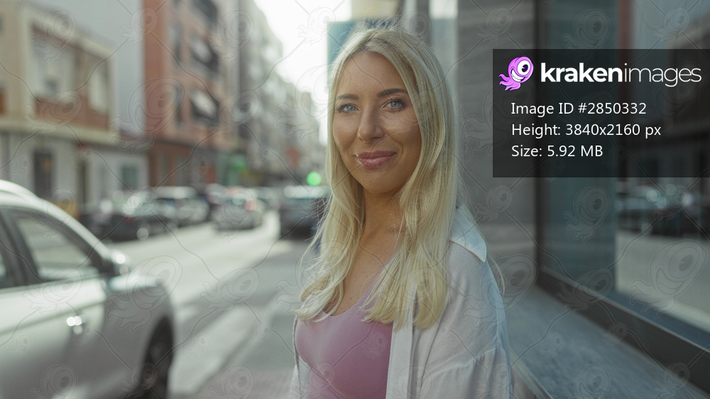 Woman pursing lips in front of a reflective glass building on a busy city street wearing a pink top; serenity.