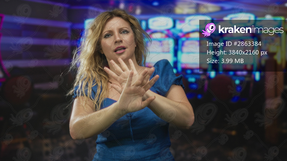 Woman pushing palms forward toward camera in studio with slot machines and neon lights, hands extended and hair moving from motion; rejection.