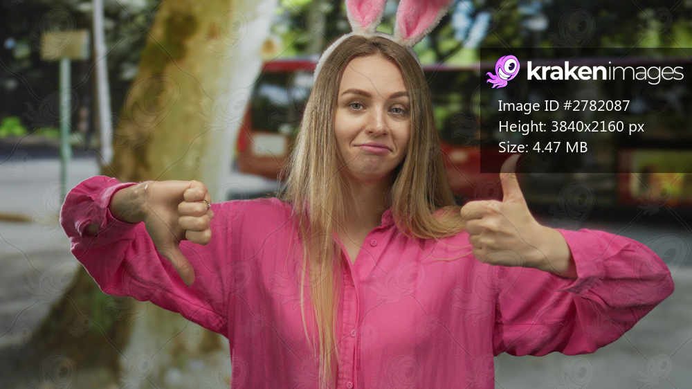 Woman with rabbit ears in pink shirt makes thumbs up and down on city street with bus passing by outdoor.