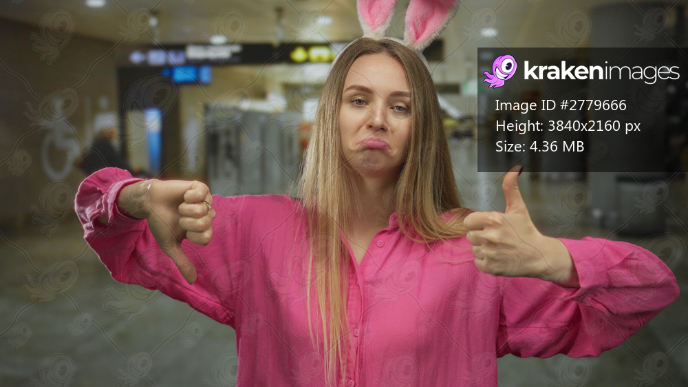 Woman with rabbit ears shows mixed gestures in an indoor airport setting wearing a pink shirt, blending humor with travel ambiance in a public space.