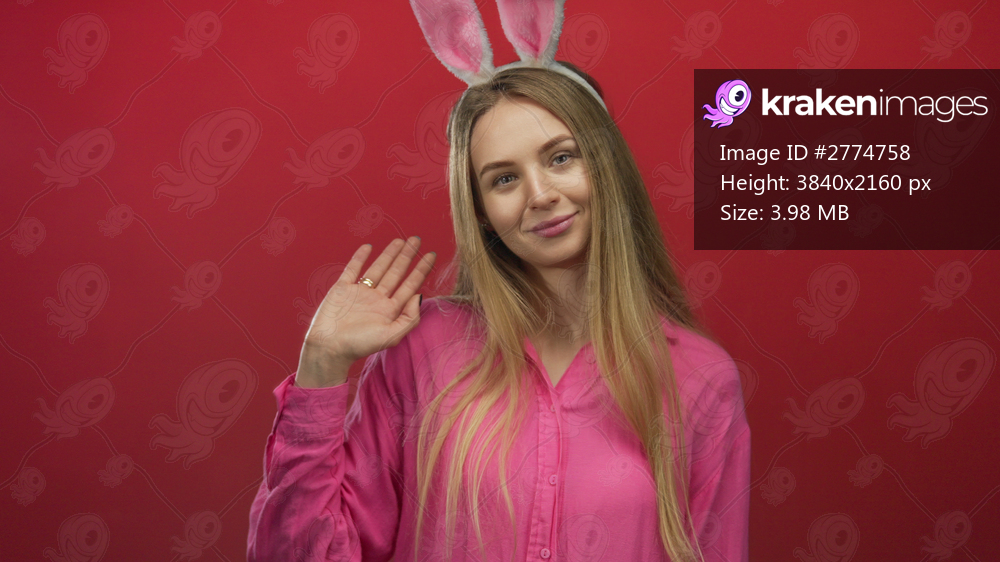 Woman with rabbit ears waving cheerfully in pink against a vibrant red wall background isolated for easter celebration or costume party.