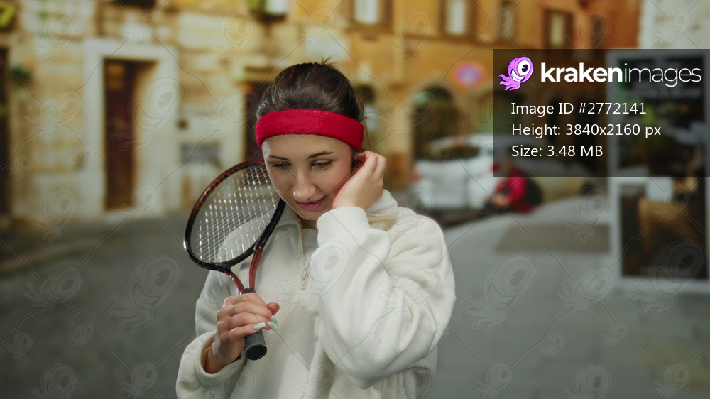 Woman with racket in city street adjusting headband, showcasing relaxed sporting posture with focus on exercise and urban life.