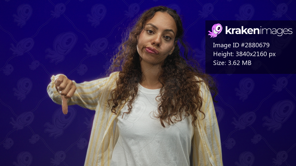 Woman with raised arm showing thumbs down, wearing yellow striped shirt and white tee in a blue studio; disapproval.