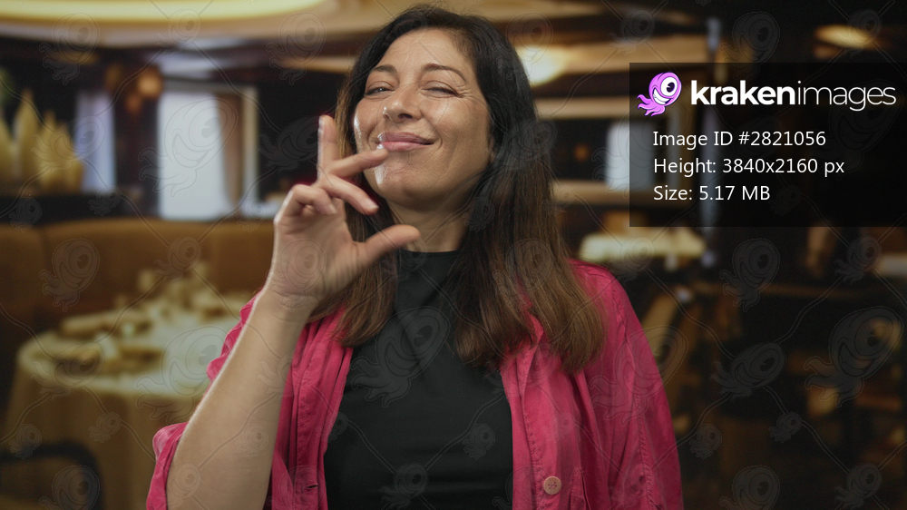 Woman with raised arms in outdoor restaurant dining area by wooden tables and upholstered chairs; approval.