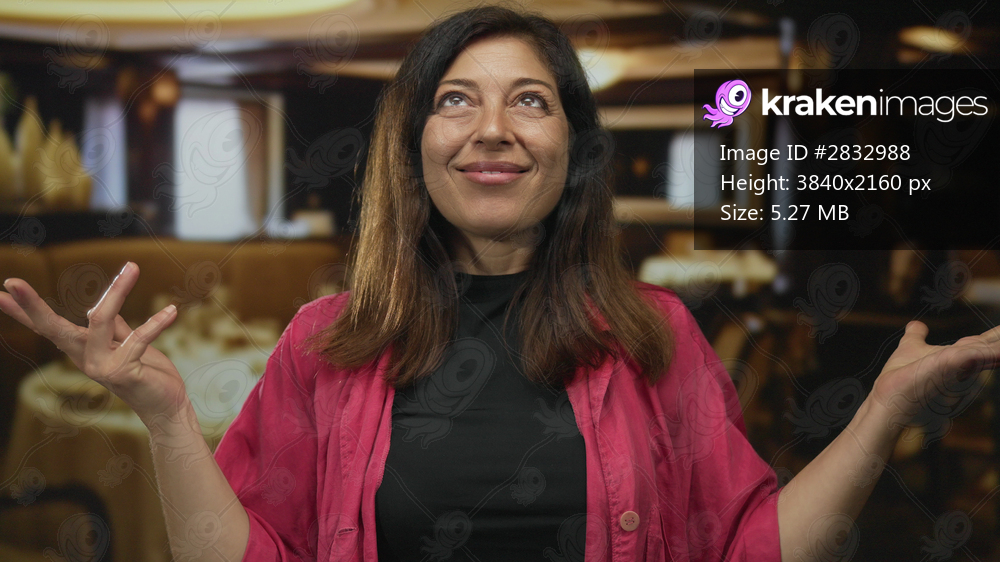 Woman with raised arms in outdoor restaurant dining area by wooden tables and upholstered chairs; approval.