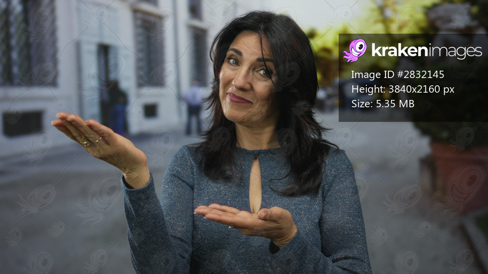 Woman with raised eyebrows gestures with open palms on busy street corner under sunlight; openness.