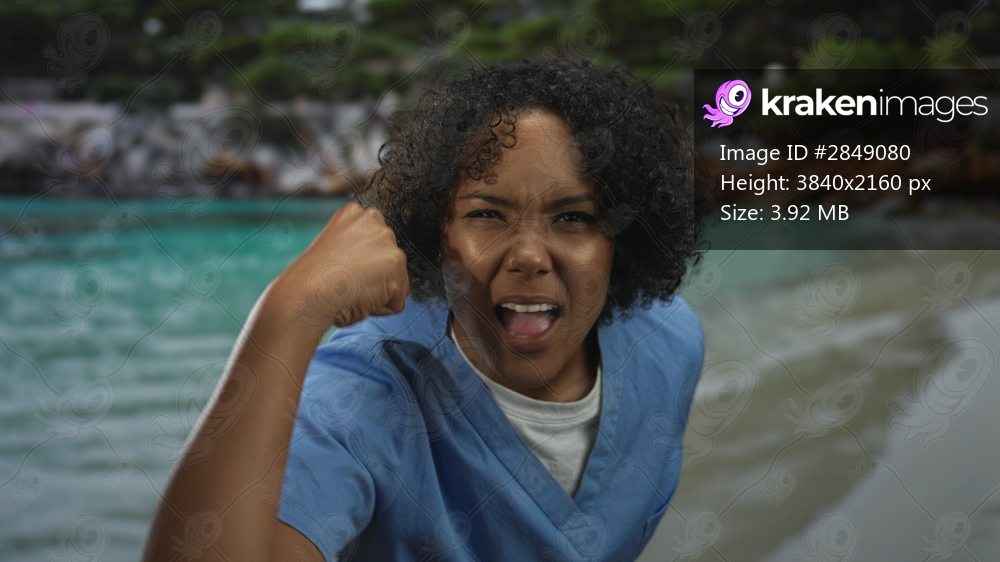 Woman with raised fist punches toward camera in forest environment; empowerment strength resilience courage.
