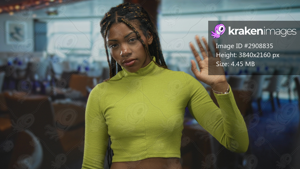 Woman with raised hand palm out in a restaurant building, cropped green top and braided hair visible; personal boundary indifference.