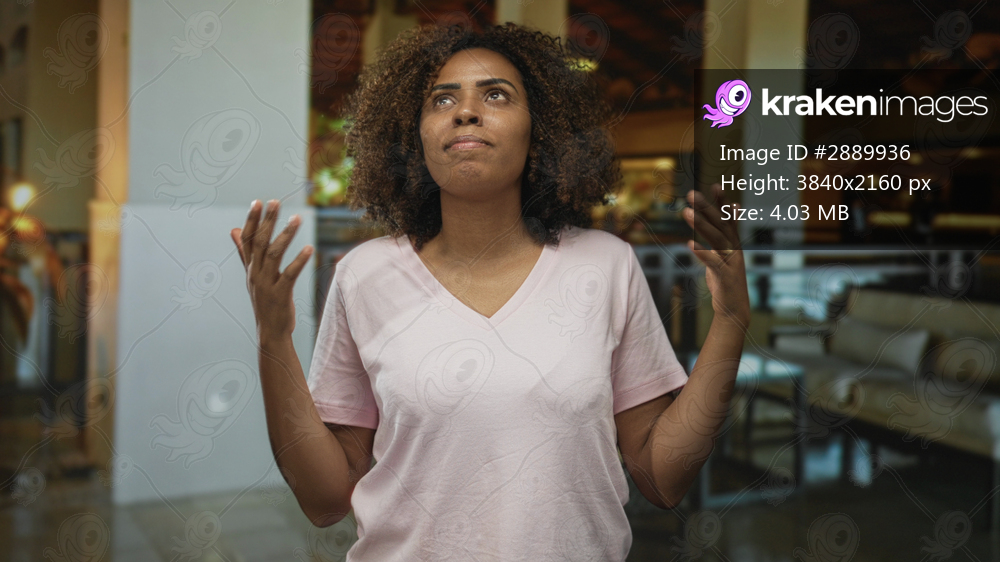 Woman with raised hands and bare palms looking upward in a hotel building lobby while wearing a pink t shirt; frustration contemplation.