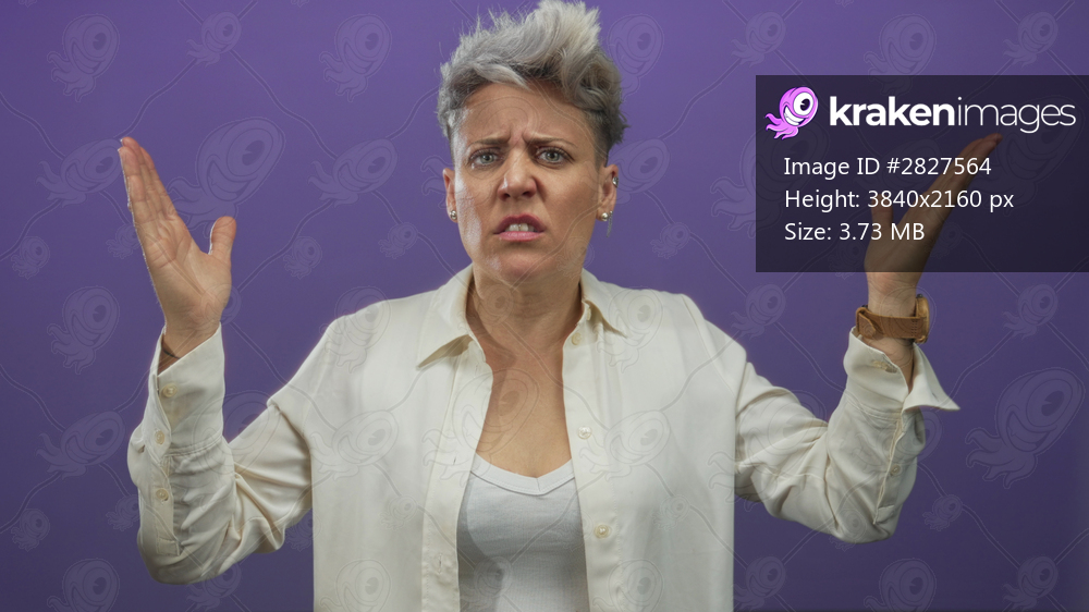Woman with raised hands, furrowed brow and short hair wearing unbuttoned white shirt in purple studio setting; frustration.