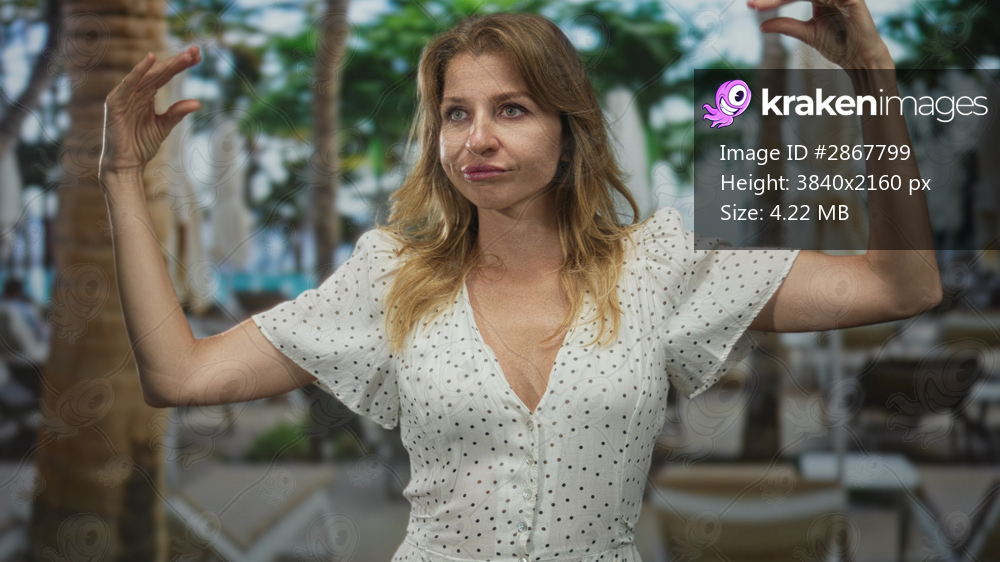 Woman with raised hands gesturing while talking at a hotel pool resort outdoors, wearing white polka dot dress and freckled face; gossip talkative.