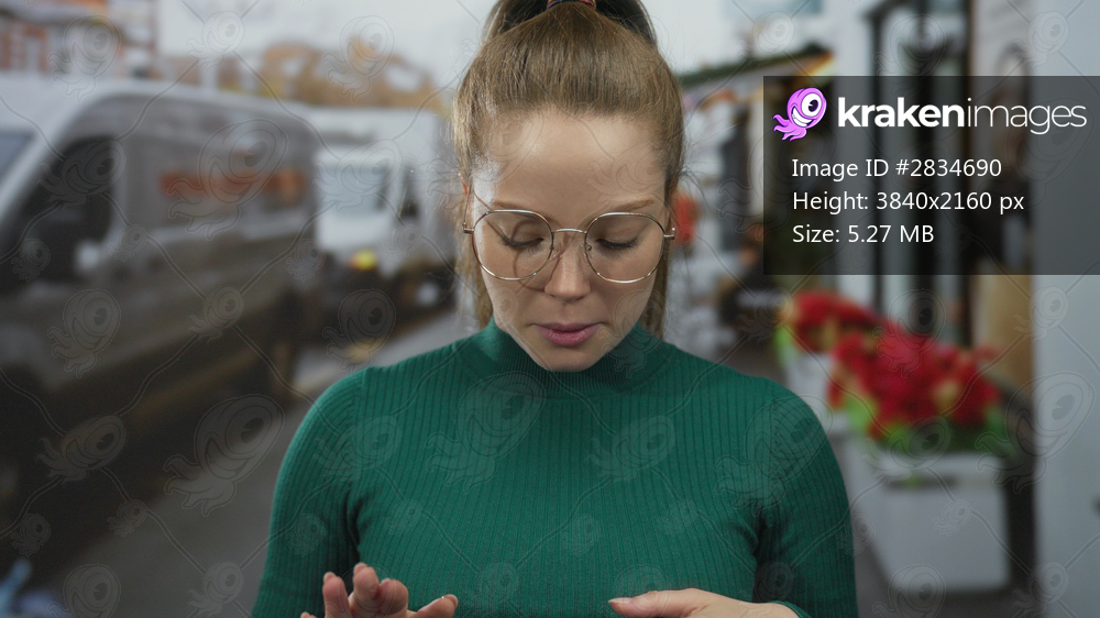 Woman with raised hands in meditation on urban street, eyes closed focusing on inner stillness; serenity calmness tranquility harmony.