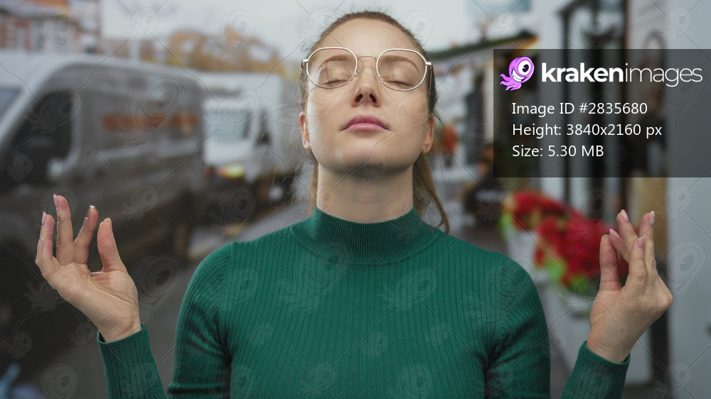 Woman with raised hands in meditation on urban street, eyes closed focusing on inner stillness; serenity calmness tranquility harmony.
