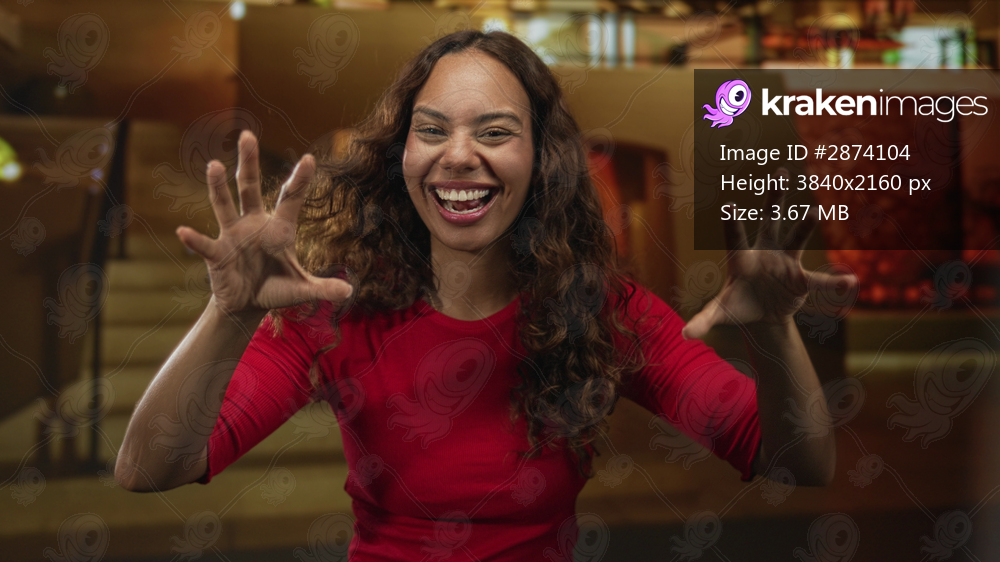Woman with raised hands making claw gesture and wide smile in building lobby near staircase; playful greeting.