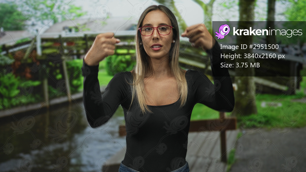 Woman with raised hands making stop and fist gestures on a street by a canal in amsterdam; focused confidence.